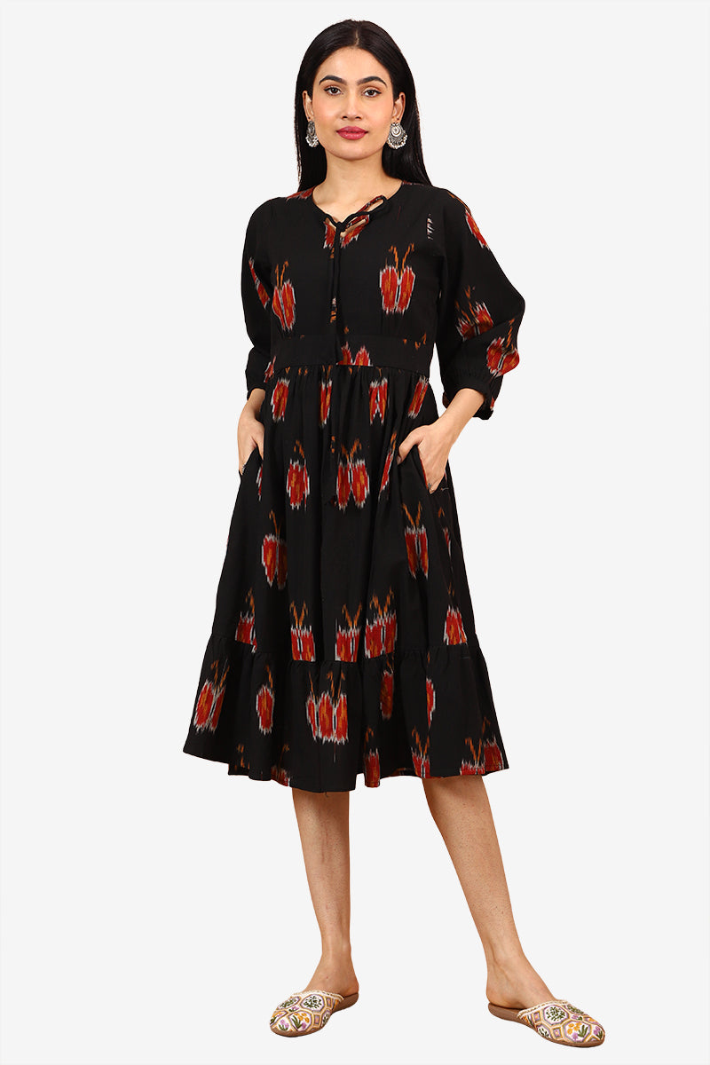Ikat Black Cotton Midi Dress