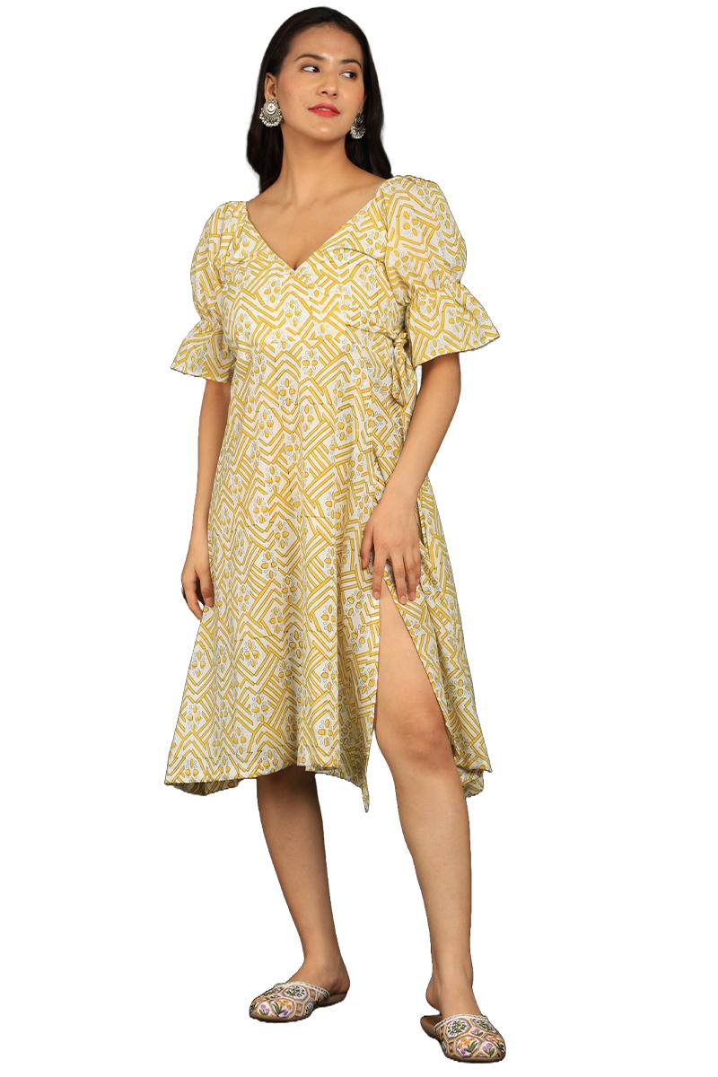 Bagru Yellow Cotton Mini Dress