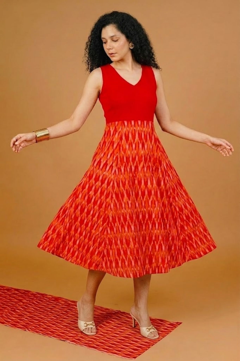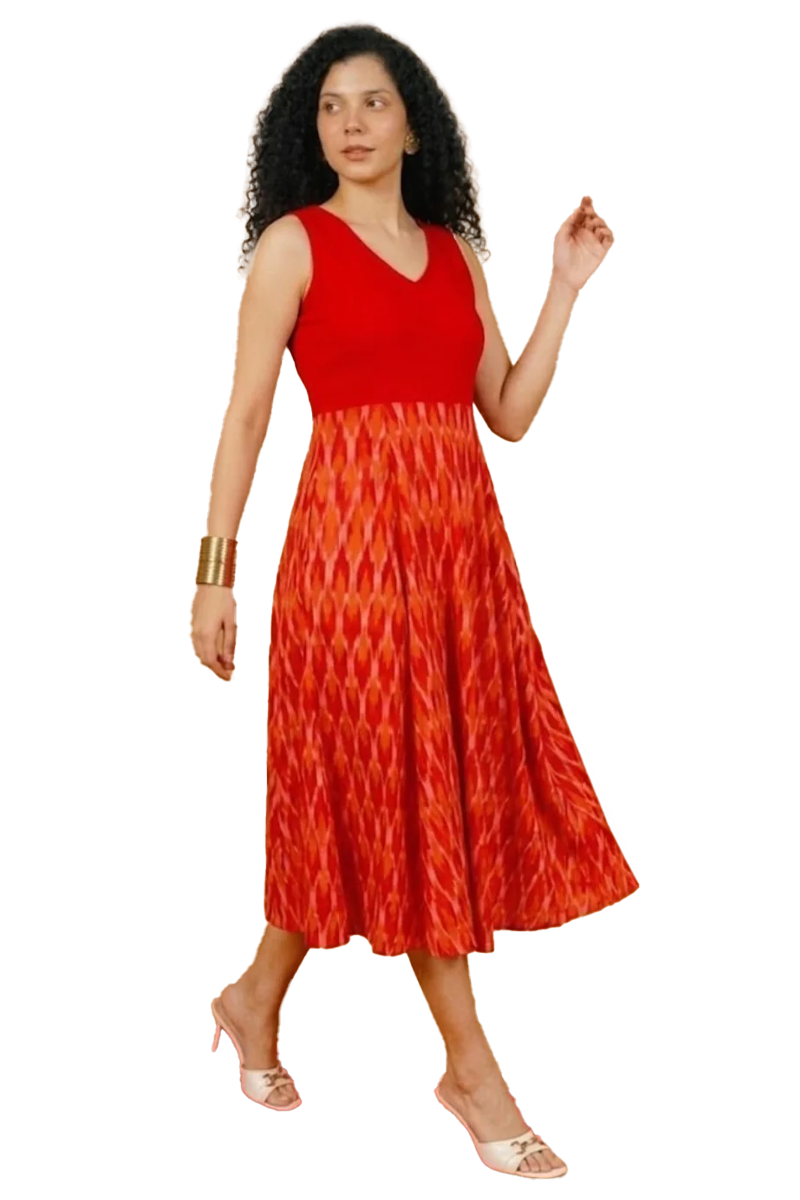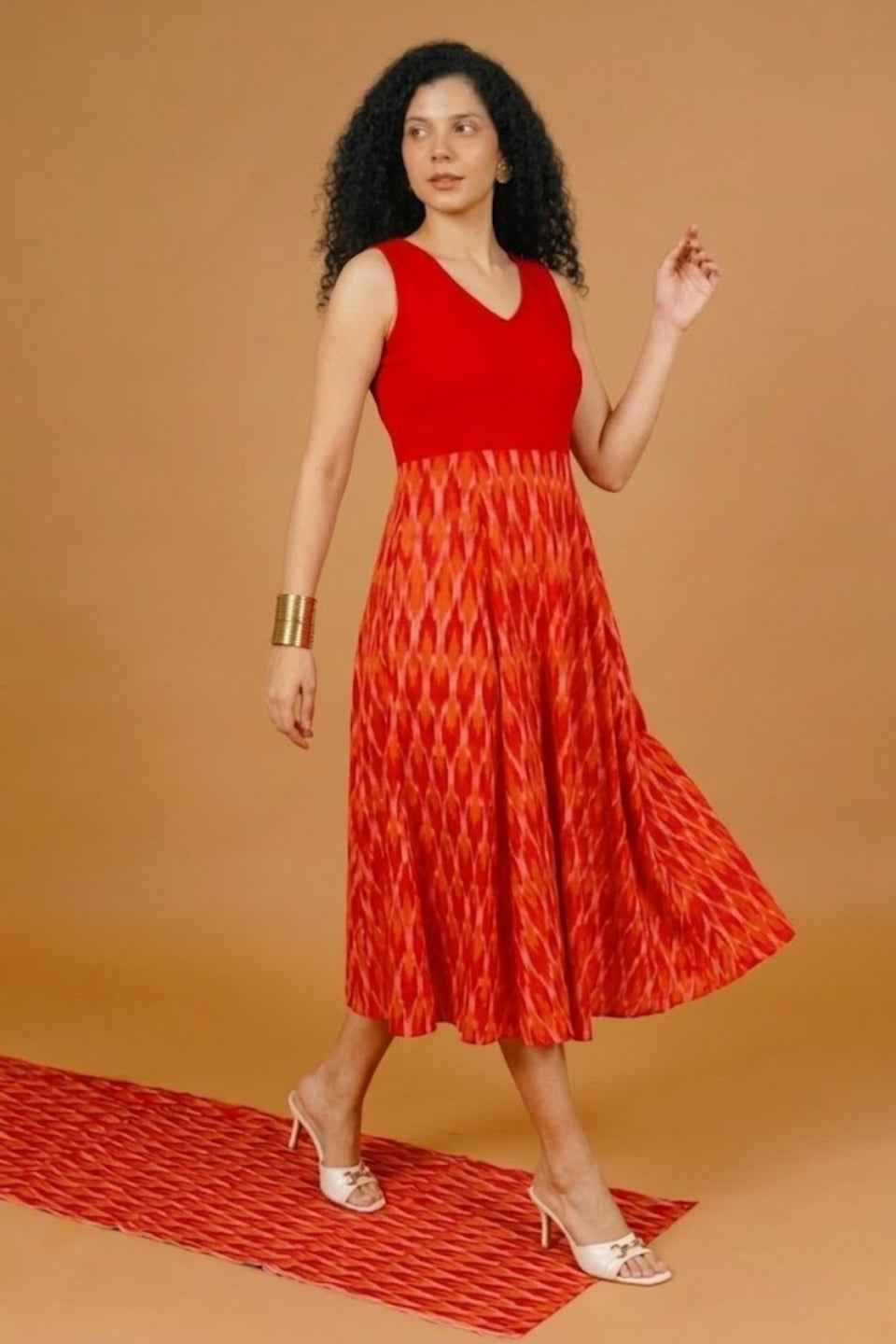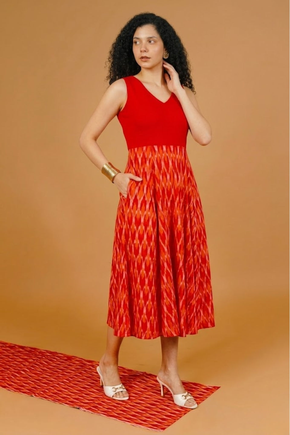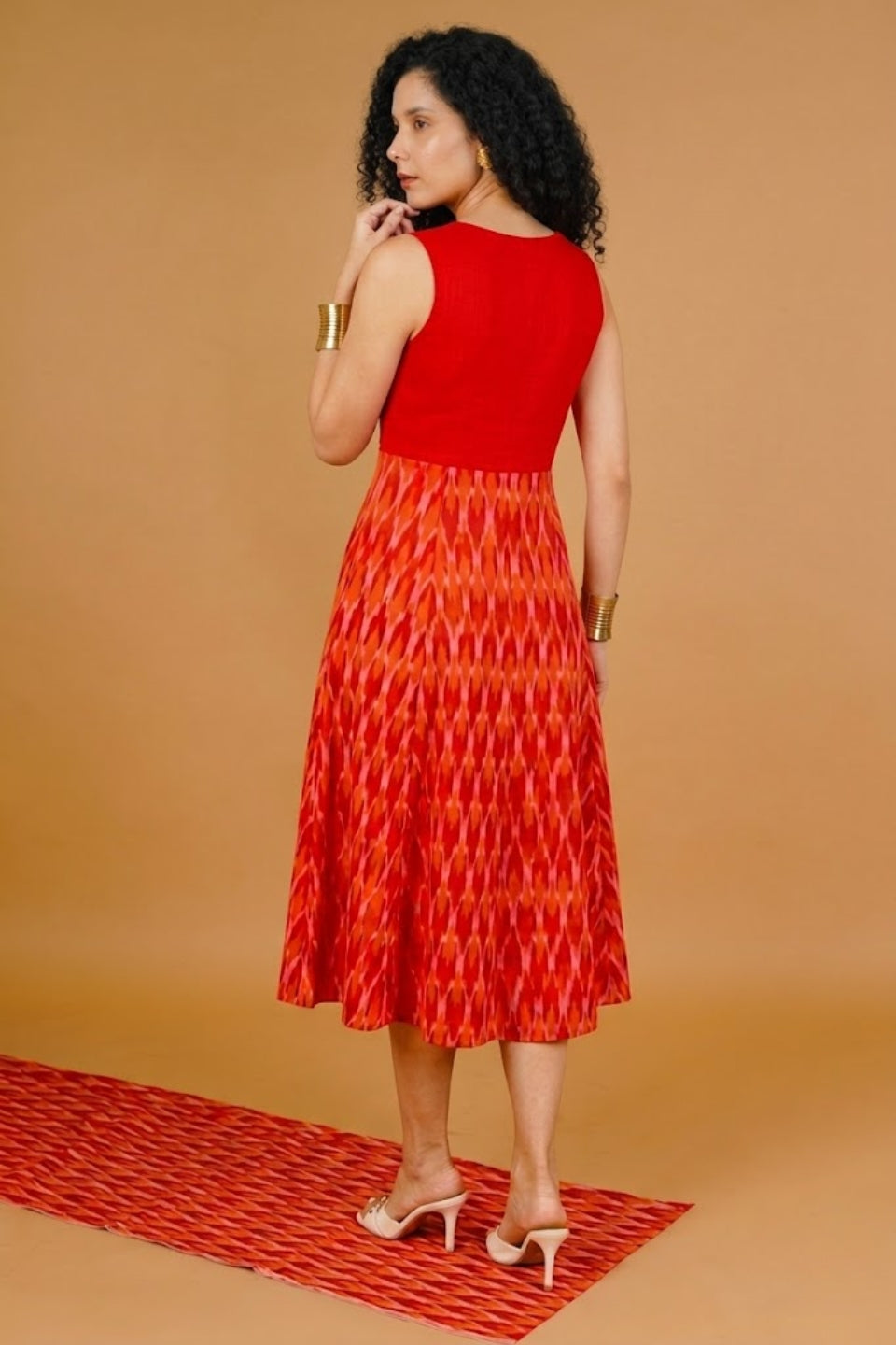 Red Ikat Midi Dress with Cotton Jersey Bodice
